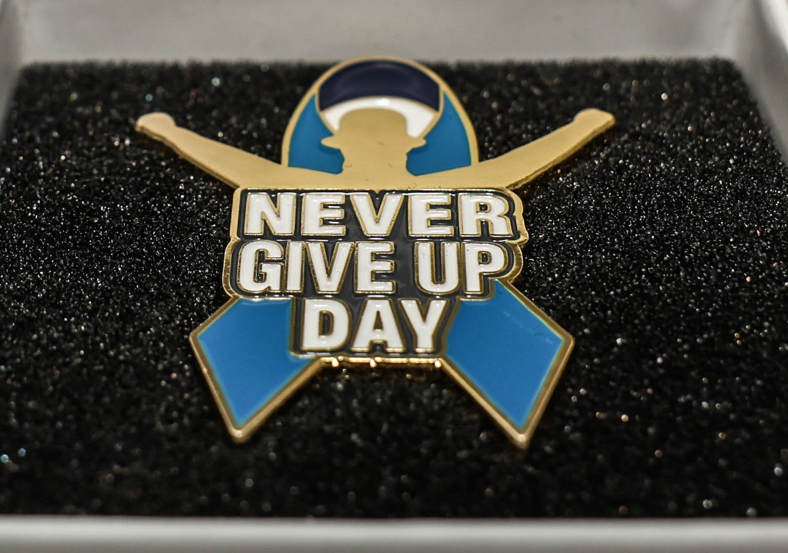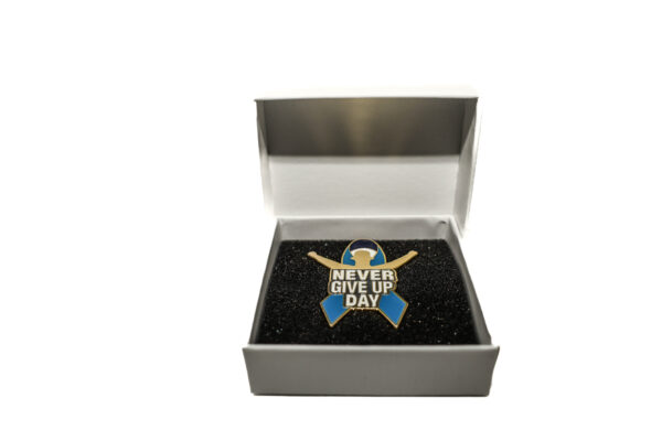 The “Never Give Up Day” ribbon pin features a blue ribbon for resilience, white text for clarity, and a gold logo for excellence. Wearing this pin symbolizes your commitment to perseverance and the relentless pursuit of your goals.