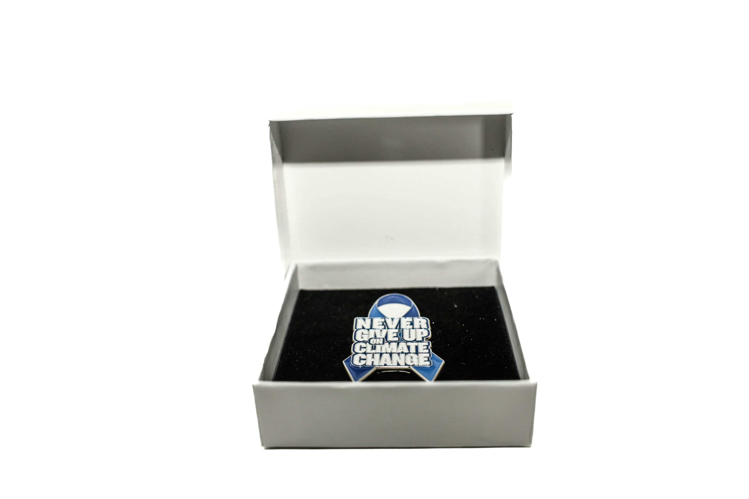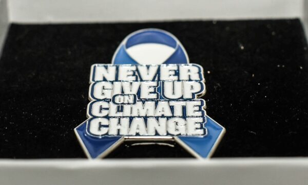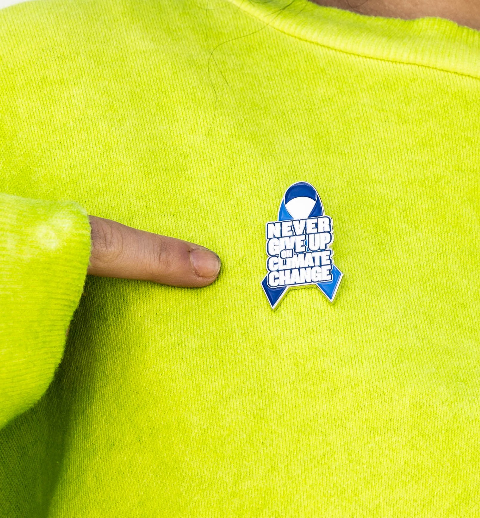 The “Never Give Up on Climate Change” ribbon pin features a blue ribbon and blue text, symbolizing our commitment to environmental protection and the global nature of climate issues.
