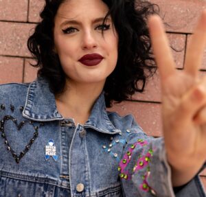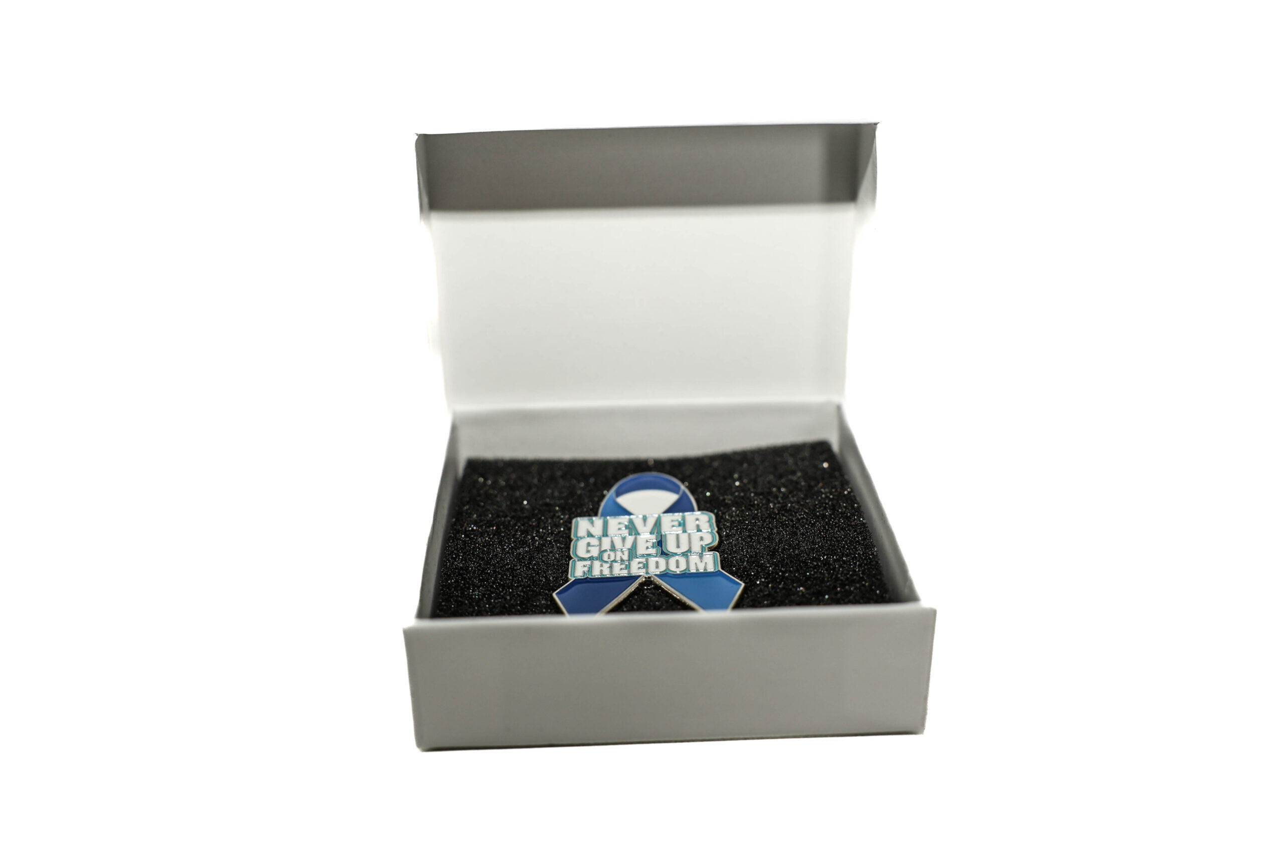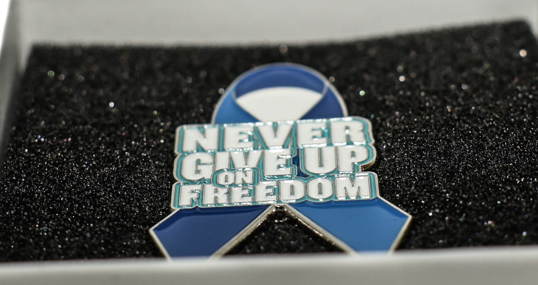 The "Never Give Up on Freedom" ribbon pins are inspired by the journey of perseverance and creativity.